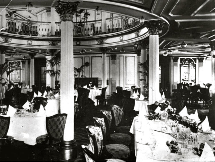 Revolutionary new turbine engines fitted in both the ‘Lusitania’ and ‘Mauretania’ enabled a service speed of 25 knots. Equipped with lifts, wireless telegraph, and electric light, they offered 50% more passenger space than other ships, with their first class decks notably featuring sumptuous furnishings.